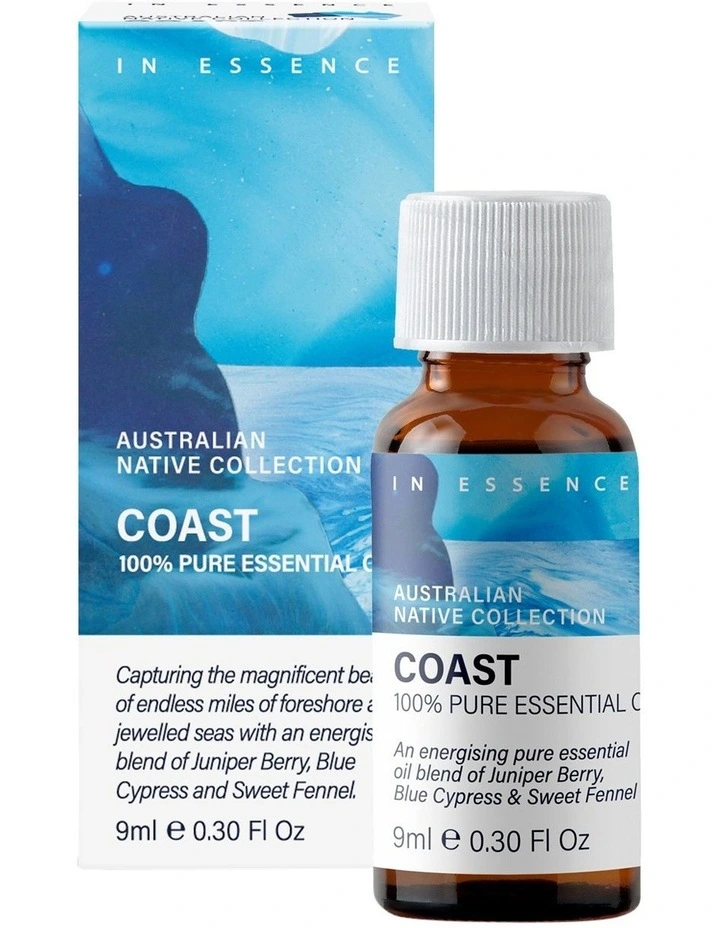 Australian Native Lifestyle Blends Coast 9mlFresh, spicy notes of Juniper Berry and Blue Cypress combined with Sweet Fennel heart note define this refreshing blend. The scent is reminiscent of endless miles of foreshore and the rhythmic flow of jewelled seas. METHODS OF USE: VAPORISE: 6 drops to bring pleasure to the senses and release the purity of the Australian landscape into your home. MASSAGE: Combine 3 drops in total to 12 mL massage base oil and massage onto area of discomfort. SPRITZ: 6 drops in 100ml Spritz bottle of water and spray surrounding air avoiding eye areaContains: Citrus Limon Peel Oil (Lemon), Cupressus Sempervirens oil (Cypress) Juniperus Communis Fruit Oil (Juniperberry), Foeniculum Fruit Oil (Sweet Fennel) Cymbopogon Flexuosus Oil (Lemongrass) Backhousia Citriodora Leaf Oil (Lemon Myrtle) Callitris Intratropica Wood oil (Blue Cypress) Not for Internal use. Keep out of reach of children. Seek medical advice if symptoms persist. Store below 30C 9mls