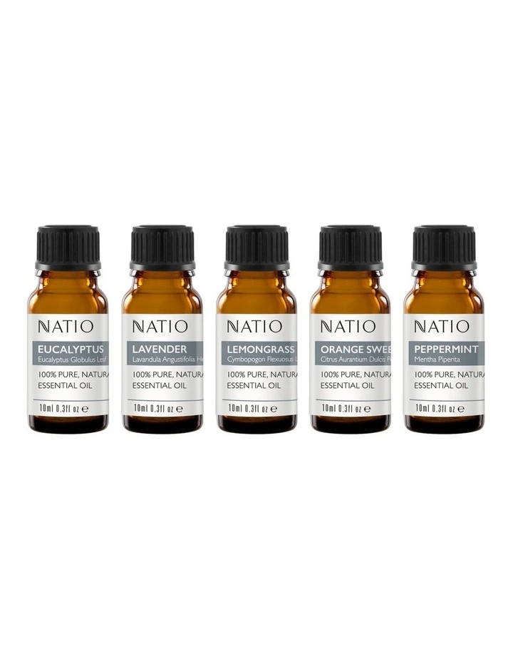 Pure Essentials gift set includes a select edit of Natios most popular and versatile essential oils:Β Pure Essential Oil – Eucalyptus 10ml, Pure Essential Oil – Lavender 10ml, Pure Essential Oil – Lemongrass 10ml, Pure Essential Oil – Orange Sweet 10ml and Pure Essential Oil – Peppermint 10ml, ready to gift in a premium fabric hard carry case.Β