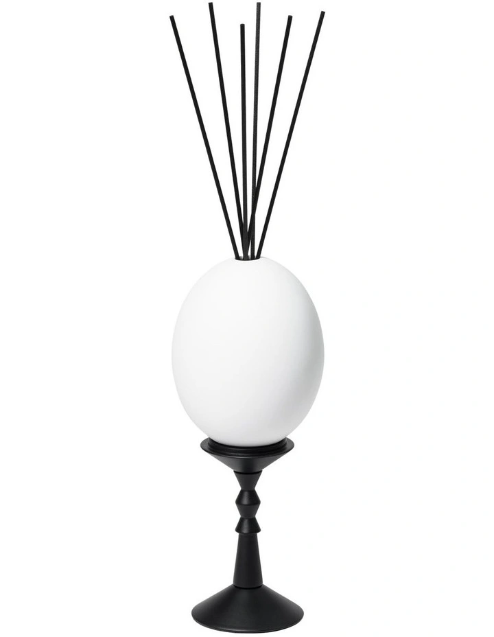 The set is composed of : an unglazed ceramic egg, a painted wooden stand, 8 reeds, a 300ml bottle containing the fragrance and a funnel.